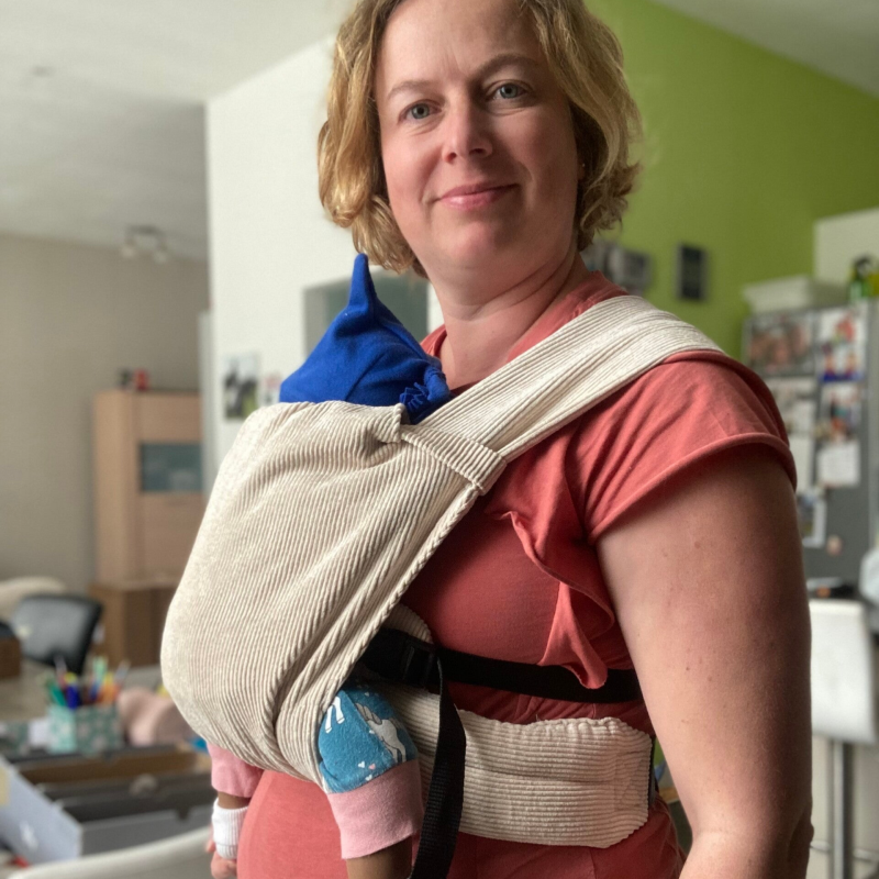 Om vanaf de geboorte te passen moeten we de drager kunnen afstellen zodat de breedte smal genoeg kan onderaan en de hoogte net tot aan de onderkant van de oorlelletjes komt.